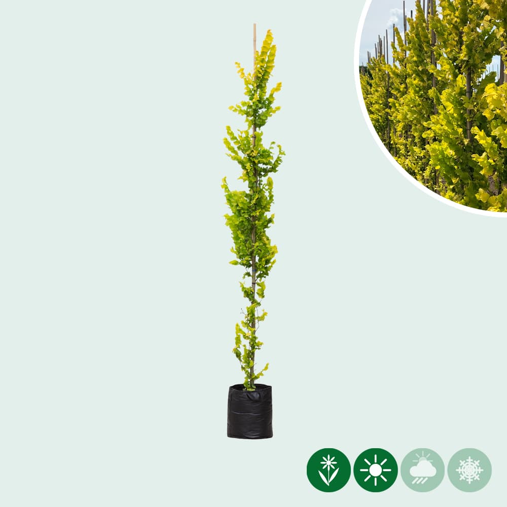 De Ulmus hollandica ‘Wredei’ staat ook wel bekend als de goudiep en staat in de categorie zuilbomen. Deze boom heeft een smalle kroon die later ovaalvormig wordt. Als lid van de iepenfamilie beschikt de goudiep over gele bladeren en blijft hij niet wintergroen. Het blad is ook het meest opvallende deel aan deze boom. Het is namelijk een opvallende kleur en gekroesd. Hierdoor kan je de stam eigenlijk nauwelijk zien. De boom doet het prima in alle soorten tuingrond. Hij staat graag in de zon of halfzon. De Ulmus hollandica ‘Wredei’ kan ook prima tegen de winter. Bij ons te bestellen in verschillende groottes.